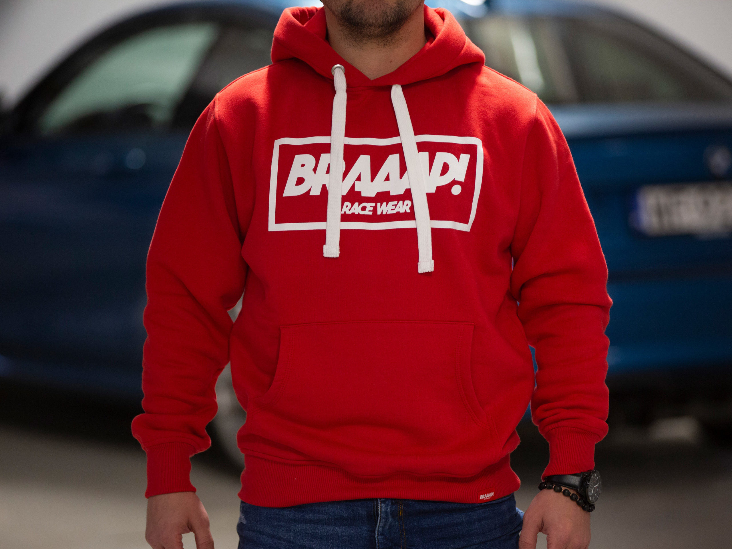 Czerwona bluza z kapturem uszyta z polskiej bawełny o gramaturze 280 g. Wytrzyma zarówno najszybsze sporty motorowe, jak i wieczorne wyjścia do miasta. Na bluzie znajdziesz wysokiej jakości nadruki wykonane technologią sitodruku.